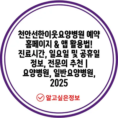천안선한이웃요양병원 예약 홈페이지 & 앱 활용법! 진료시간, 일요일 및 공휴일 정보, 전연락 추천 | 요양병원, 일반요양병원, 2025에 대해 알아보겠습니다.